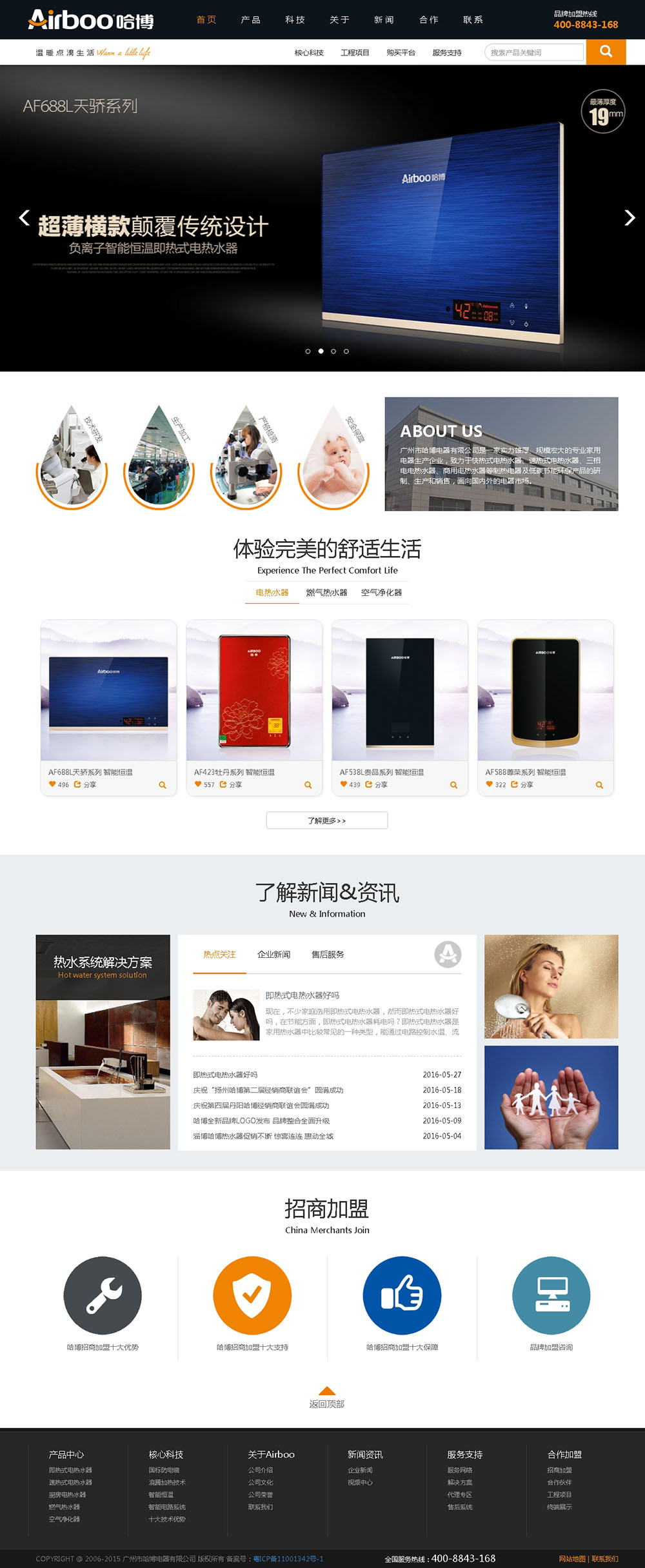廣州市現科信息科技有限公司(現科網絡)成立于2008年,是廣州市最早從事企業網站建設及推廣服務的公司。主營業務:網站建設、企業軟件開發、H5響應式網站制作、營銷型網站、企業郵箱、微信小程序開發。業務咨詢:15915781289。廣州市哈博電器有限公司是一家實力雄厚、規模宏大的專業家用電器生產企業,成立于2007年,專注于快速加熱技術的研發與生產。專業從事即熱式電熱水器、快熱式電熱水器、速熱式電熱水器、三相電電熱水器、商用電熱水器等制熱電器及低碳節能環保產品,是集產品專業研發、制造、銷售和服務為一體的現代化實力企業。經過近十年的穩健發展,哈博在科技、質量與品牌三個方面分別贏得了市場的高度認可,其產品研發、設計、工藝上也均有突出的優勢,是掌握快熱行業核心科技的現代化企業之一。
