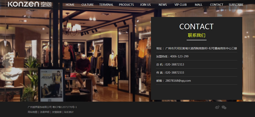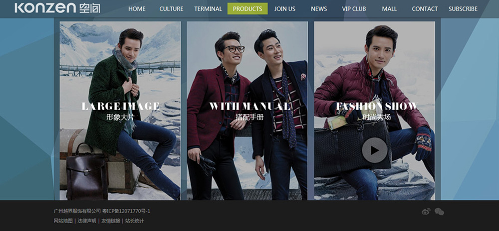 廣州市現(xiàn)科信息科技有限公司(現(xiàn)科網(wǎng)絡(luò))成立于2008年,是廣州市最早從事企業(yè)網(wǎng)站建設(shè)及推廣服務(wù)的公司。主營業(yè)務(wù):網(wǎng)站建設(shè)、企業(yè)軟件開發(fā)、H5響應(yīng)式網(wǎng)站制作、營銷型網(wǎng)站、企業(yè)郵箱、微信小程序開發(fā)。業(yè)務(wù)咨詢:15915781289。廣州越界服飾有限公司成立于1999年,經(jīng)過十多年的發(fā)展,已成為集生產(chǎn)、研發(fā)、銷售、服務(wù)于一體的綜合服飾企業(yè),建立了在設(shè)計、營銷、信息化、企業(yè)文化等方面的核心競爭優(yōu)勢,并榮獲“廣東省服裝產(chǎn)業(yè)轉(zhuǎn)型升級重點培育企業(yè)”及“廣東服裝最佳雇主企業(yè)”稱號,旗下品牌konzen(空間)榮獲“中國休閑服飾最具影響力品牌”、“廣東服裝最受消費者歡迎品牌”稱號。
