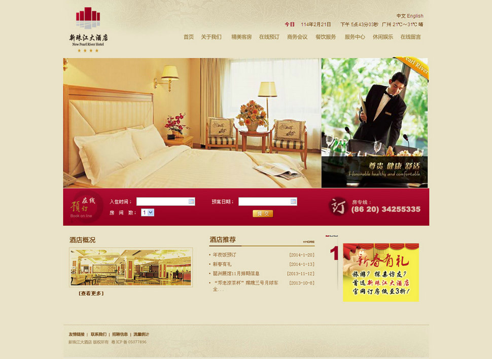 廣州新珠江大酒店 廣州市現科信息科技有限公司(現科網絡)成立于2008年,是廣州市最早從事企業網站建設及推廣服務的公司。主營業務:網站建設、企業軟件開發、H5響應式網站制作、營銷型網站、企業郵箱、微信小程序開發。業務咨詢:15915781289。廣州新珠江大酒店,座落在廣州濱江東路江畔大型圍合式庭苑水岸社區。瀕臨珠江,南依中山大學,環境優美。 訪問此網站