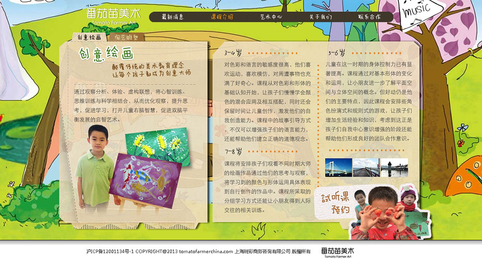 廣州市現(xiàn)科信息科技有限公司(現(xiàn)科網(wǎng)絡(luò))成立于2008年,是廣州市最早從事企業(yè)網(wǎng)站建設(shè)及推廣服務(wù)的公司。主營業(yè)務(wù):網(wǎng)站建設(shè)、企業(yè)軟件開發(fā)、H5響應(yīng)式網(wǎng)站制作、營銷型網(wǎng)站、企業(yè)郵箱、微信小程序開發(fā)。業(yè)務(wù)咨詢:15915781289。我們理念在經(jīng)營一塊福田,讓孩子經(jīng)過我們的播種、栽培,茁壯成長,成為大小、顏色變化多樣的番茄,就像每個藝術(shù)家一樣都有自己獨特的特質(zhì),孩子都還是幼苗成長階段,因此取名為番茄苗美術(shù)中心,而我們都是一群快樂的番茄農(nóng)夫。
